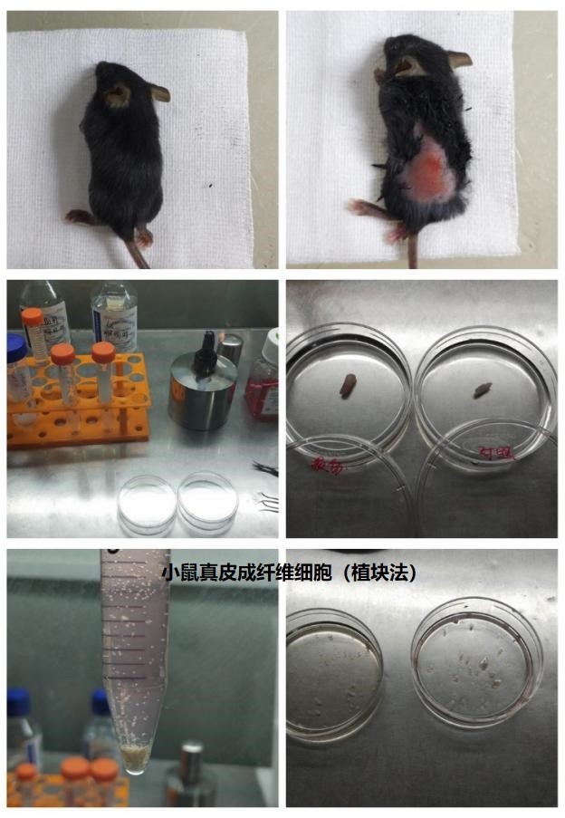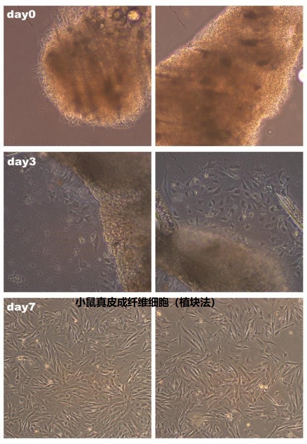 简述:小鼠脱颈处死后,75%乙醇浸泡5min,备皮,去背部皮肤约1cm2置于含双抗的PBS中,仔细剥离脂肪血管等多余组织,去除表皮,将真皮部分清洗后于培养皿内剪碎,加入适量胰酶,37℃消化1h;加入H-DMEM完全噢诶杨及终止反应,PBS清洗组织块后均匀铺于10cm培养皿内,加入5ml培养基放入培养箱内,24h后补充培养基至10ml,3-4天后可见有细胞游出。